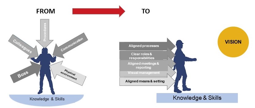 Organisational alignment means that vision, strategic goals, targets, the operating model, behaviour and skills of the people in the organisation are in line with each other. This is shown in the figure below.