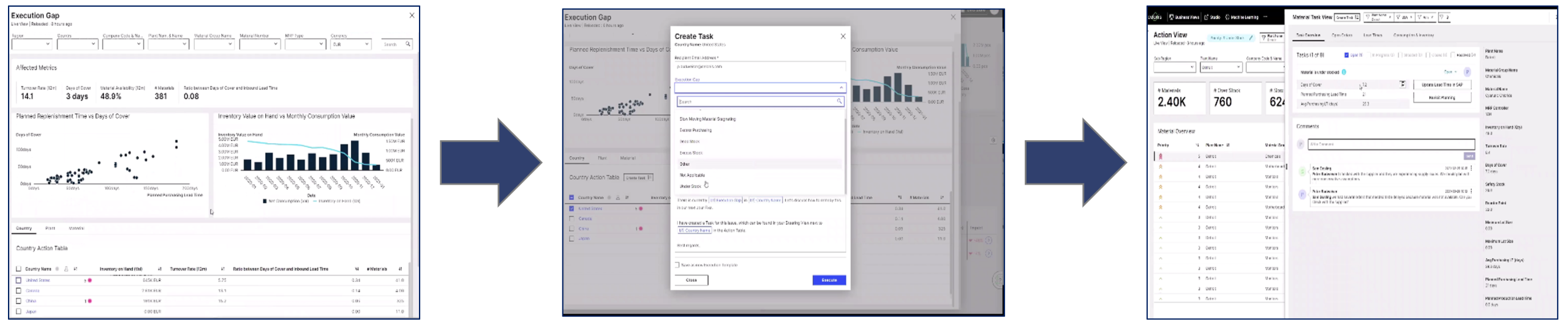 De interactieve rapporten markeren hiaten tussen werkelijke en streefwaarden en geven details over de afwijkingen, figuur A. Door op een van de gemarkeerde problemen te klikken, kunt u een passende actie toewijzen aan een specifieke persoon, figuur B. Of het kan zelfs automatisch worden gedaan wanneer een afwijking wordt geconstateerd. En directe communicatie met betrekking tot de actie wordt in real-time gefaciliteerd, figuur C.