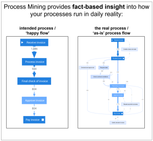 In plaats van te werken met de ontworpen procesflow of de procesflow die wordt weergegeven in het ERP-systeem, bewaakt process mining het daadwerkelijke proces op elke gewenste granulariteit: end-2-end proces, procure-2-pay, productie, voorraadbeheer, crediteuren, voor een specifiek type product, leverancier, klant, individuele bestelling, individuele SKU. Process mining bewaakt compliance, conformiteit, samenwerking tussen afdelingen of tussen klant, eigen afdelingen en leveranciers, etc.
