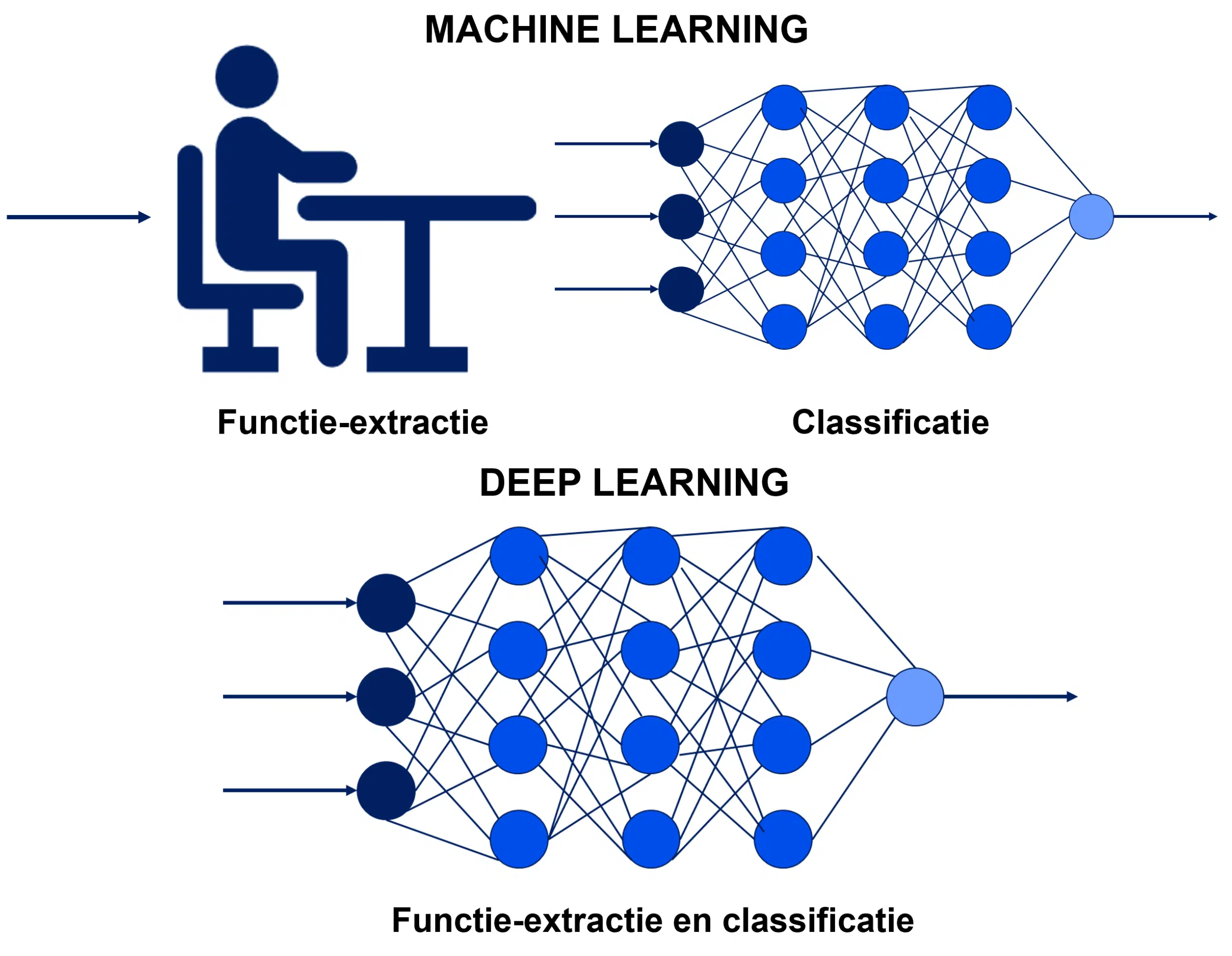 HET VERSCHIL TUSSEN MACHINE LEARNING EN DEEP LEARNING IS IN DE MANIER WAAROP EEN ALGORITME LEERT