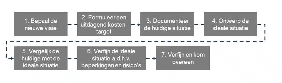 De antwoorden op deze vragen worden de input voor een iteratief proces dat begint met een herontwerp van end-to-end bedrijfsprocessen. Vervolgens wordt de organisatiestructuur ontworpen om in deze nieuwe processen te passen. Het ontwerp begint altijd met een blanco vel papier. Door de bestaande staat te vergelijken met de ideale staat, worden veel kansen geïdentificeerd voor zowel besparingen als nieuwe groeimogelijkheden.